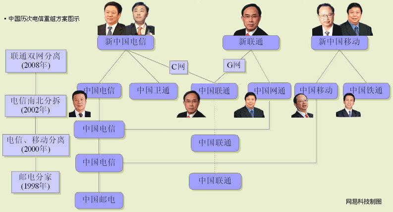 | ● 拆分中國聯通 2008年5月23日,中國電信收購中國聯通CDMA網(包括資產和用戶),中國聯通與中國網通合并,中國衛通的基礎電信業務并入中國電信,中國鐵通并入中國移動。 |
